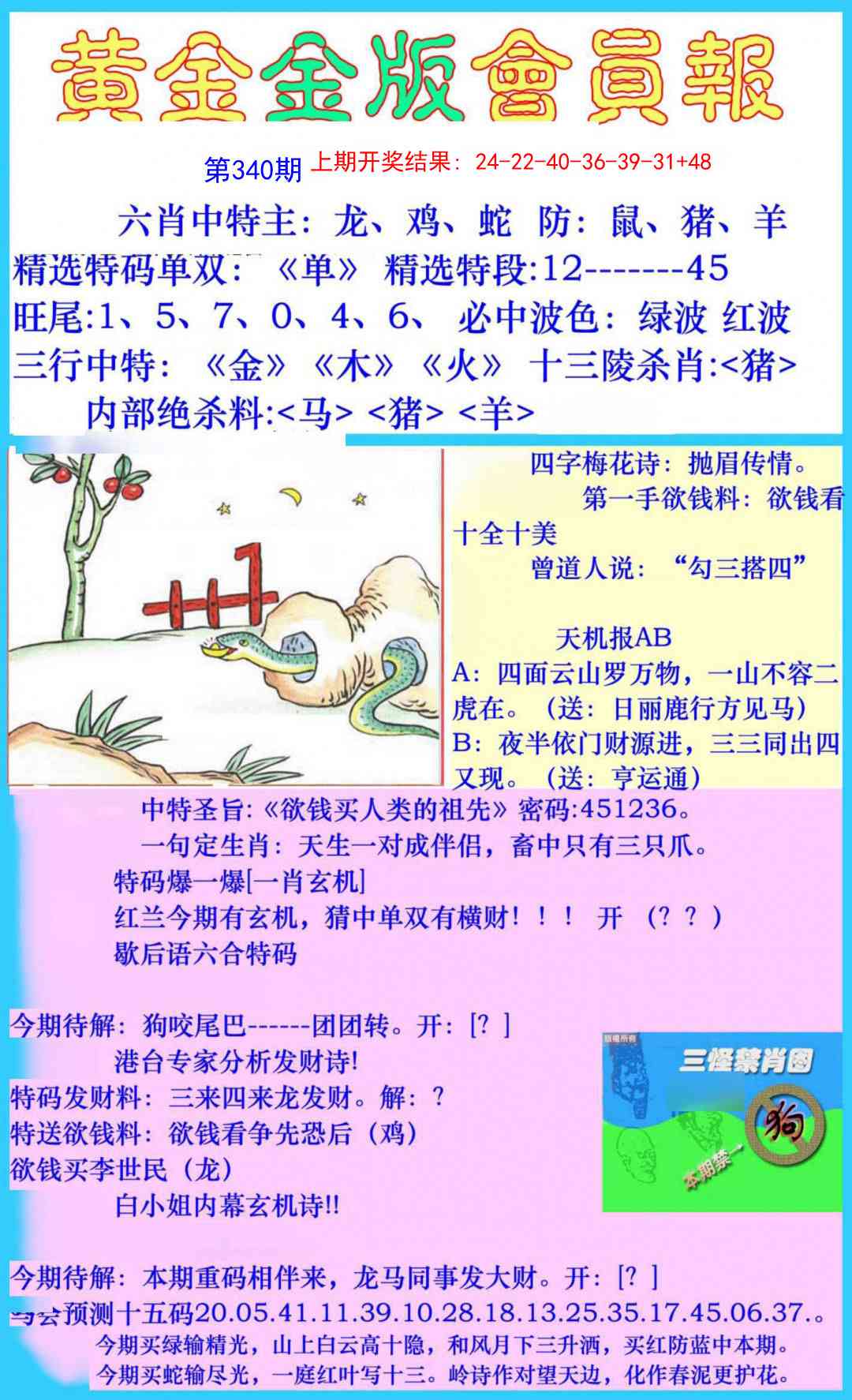 | 340期: | 蛇 | 绿单 | 5尾 | 1头 | 开?00准 |